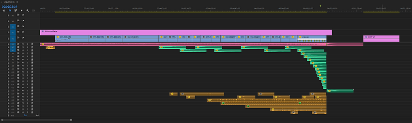 As you can see below, this is what the timeline looks like after adding all sound elements to this cut. I will be going through all of the decisions I made throughout this process as, as you can see, there are quite a lot of layers. I have categories the sound layers via the use of colour to make it easier to understand what is what. This is not only to show to you and prove my understanding, but it also actually helps me in the editing process too! With the amount of layers there are, colour coding has seemed very useful for me as I’ve been able to understand what I’m editing and where it should be positioned within the sequence.